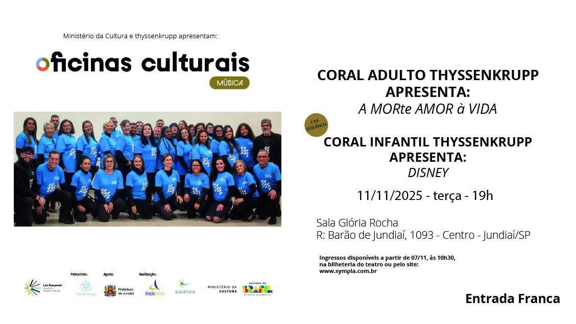 Sinopse: os corais infantil e adulto do projeto Oficinas Culturais de Campo Limpo Paulista apresentam-se na Sala Glória Rocha, na Rua Barão de Jundiaí, no centro de Jundiaí, em um espetáculo gratuito que celebra o trabalho desenvolvido ao longo do segundo semestre. Cada coral exibirá sua identidade musical e cênica, com repertórios cuidadosamente selecionados para encantar e envolver