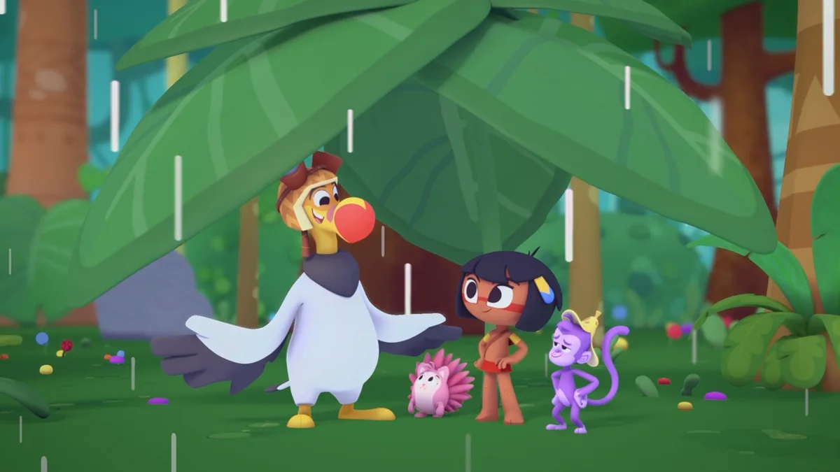 A menina indígena Tainá, o urubu-rei Pepe, o macaco Catu e a ouricinha Suri são os Guardiões da Amazônia. Mas hoje está chovendo e os animais estão todos recolhidos, abrigados embaixo de uma grande folha. Suri, no entanto, não está muito feliz. Ela morre de medo de chuva e conta que uma vez quase se machucou numa tempestade. Um a um, os Guardiões contam suas histórias sobre a chuva.